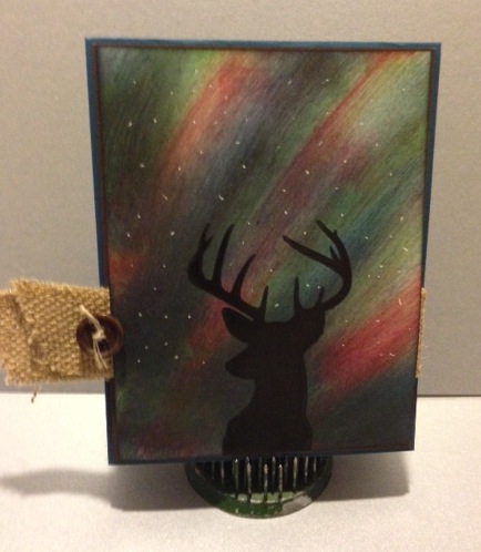 This technique looks fancy shmancy but it is actually very simple to do. You can Google the northern lights stamping technique and there are several YouTube videos on how to do it so I am not going to detail the technique here, just the colors and products I used. I do have two tips. I got the deer to be so nice and crisp by re-inking my pad right before we stamped him. And if you get a smudge of the black from the stamp edge or clumsy stamping (me!!!), you can use your finger to smudge the ink into the background. You have to do it right away before the ink dries completely but you won’t see your mistake at all!