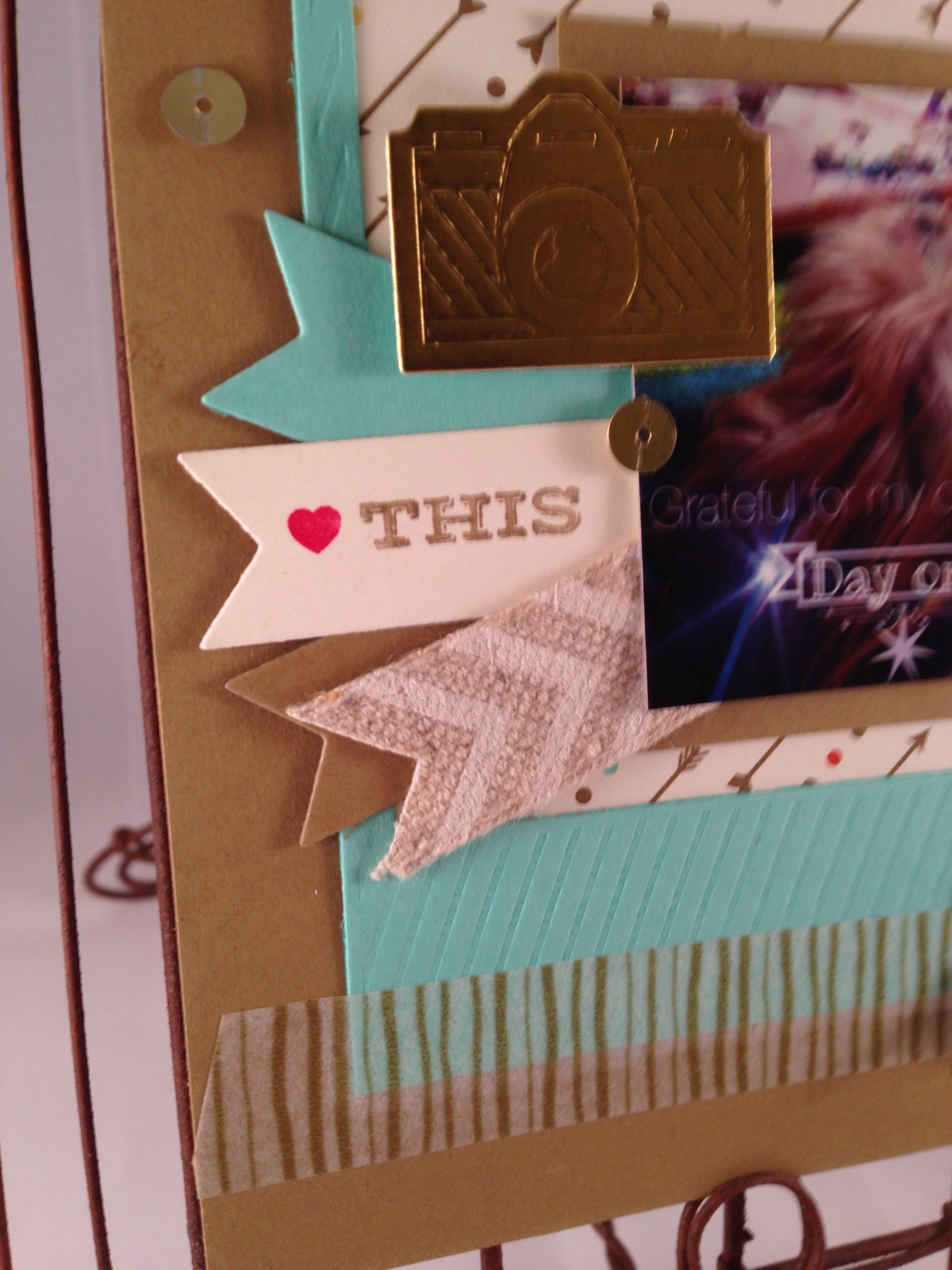 Today’s card features the On Film framelits and the Hip Notes stamp set as well as the Retro Fresh Designer Paper.  I am participating in a photo project this year called 365 Days of Gratefulness.  The pic of my puppy helping me craft was my first pic for the year 🙂  I added it as the centerpiece of the card inside the polaroid framelit.  You can’t see the detail on that frame but if you see the little gold camera?  Those framelits not only cut out the image but add lots of adorbs detail!  Yummmmmy!