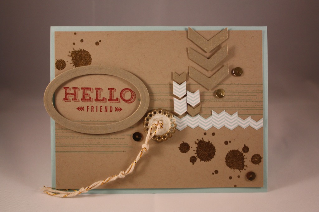 I used Pool Party and Crumb Cake Paper along with Pool Party and Cherry Cobbler Ink. I just love how the Crumb Cake, Pool Party and Cherry Cobbler work together. Pretty much everything else is gold, gold and more gold! I also did some paper piecing, sort of. I cut one of the chevron patterns out of the I Am Me DSP and cut some over chevrons out of brushed gold. I also punched some gold chevrons with the chevron punch. I layered and piled the chevrons and I love the final result. Stamps sets featured are Gorgeous Grunge and Peachy Keen. My final gold accents are the gold sequins and embossed gold splats from Gorgeous Grunge.