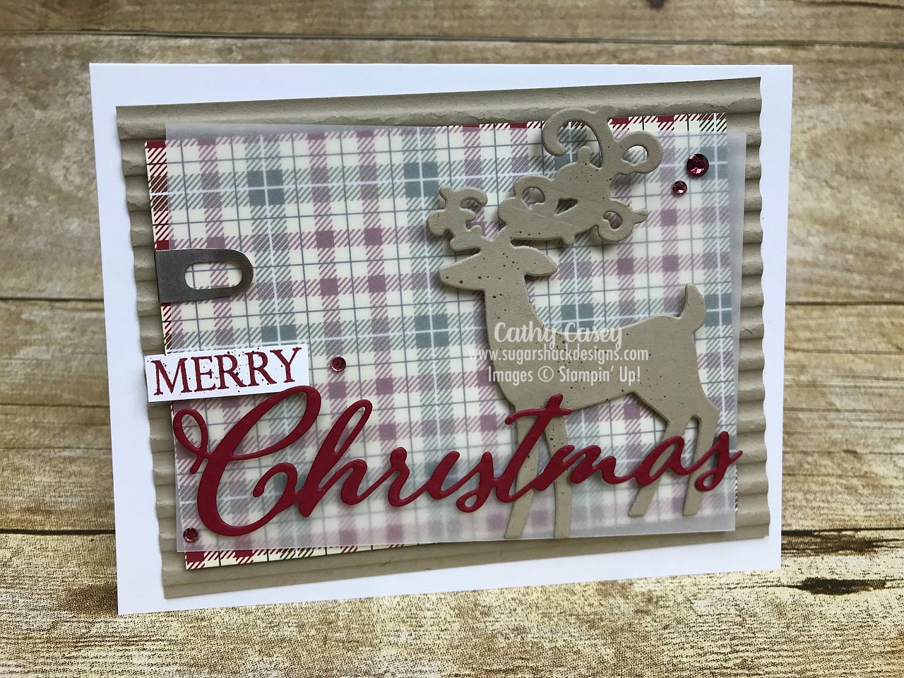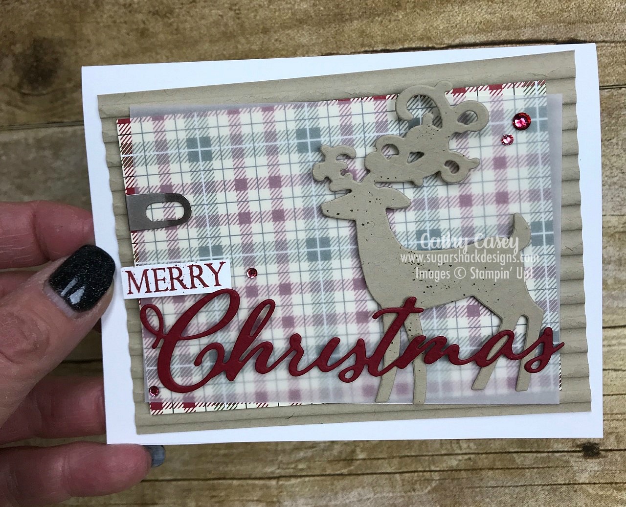 I am loving the Festive Farmhouse Suite this year with the super cute plaid paper in the Festive Farmhouse Designer Series Paper. I added a deer die cut and the fabulous “Christmas” die cut and voila, I had a cute country-style Christmas card!