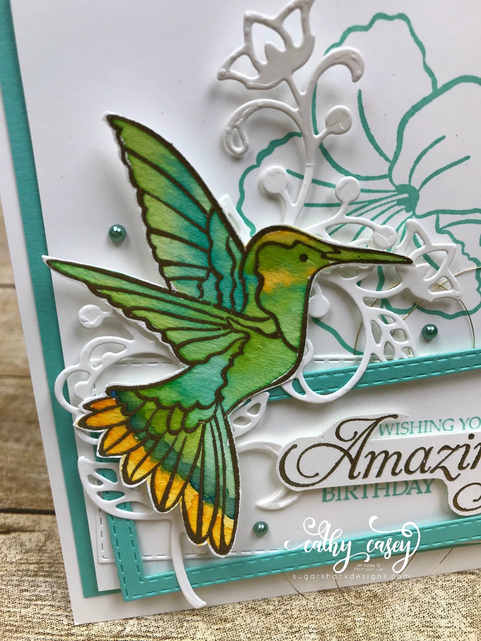 I have created quite a few cards with the lovely Humming Along set.  I just purchased the coordinating framelits, so I will be having more stamping fun with this gorgeous set!  For this card, I gold embossed the hummingbird image on watercolor paper and then watercolored with Lemon Lime Twist, Coastal Cabana, Daffodil Delight, Bermuda Bay, Mango Melody and Blueberry Bushel.  I love how my sweet birdie came out!  The rest of the card features the large flower from the set stamped in the background in Coastal Cabana and several die cuts with the new Rectangle Stitched Framelits – these dies are must haves!!!