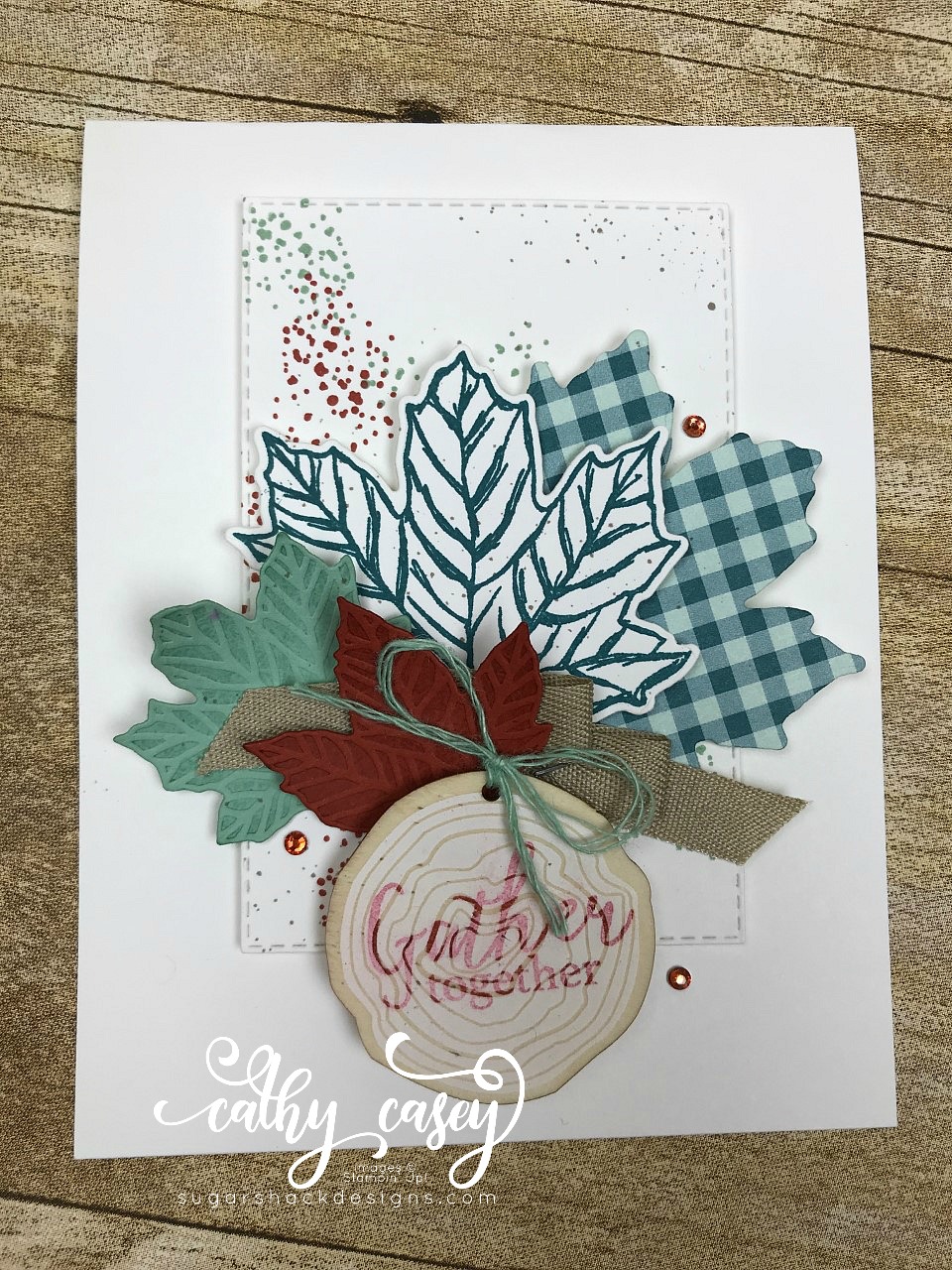 My holiday pre-order arrived on Friday and I could not wait to play with my new goodies!  My card today features the Gather Together stamp set and coordinating dies.  I absolutely love the Tags & Feathers Elements and I used the tree slice and stamped my sentiment on that.  As you can see the sentiment is not very vibrant, I think that is because the tree rings, which are soooo very cute!, don’t allow the ink to saturate the wood piece.  I am going to try embossing my sentiment on my next project and I think that will be better!