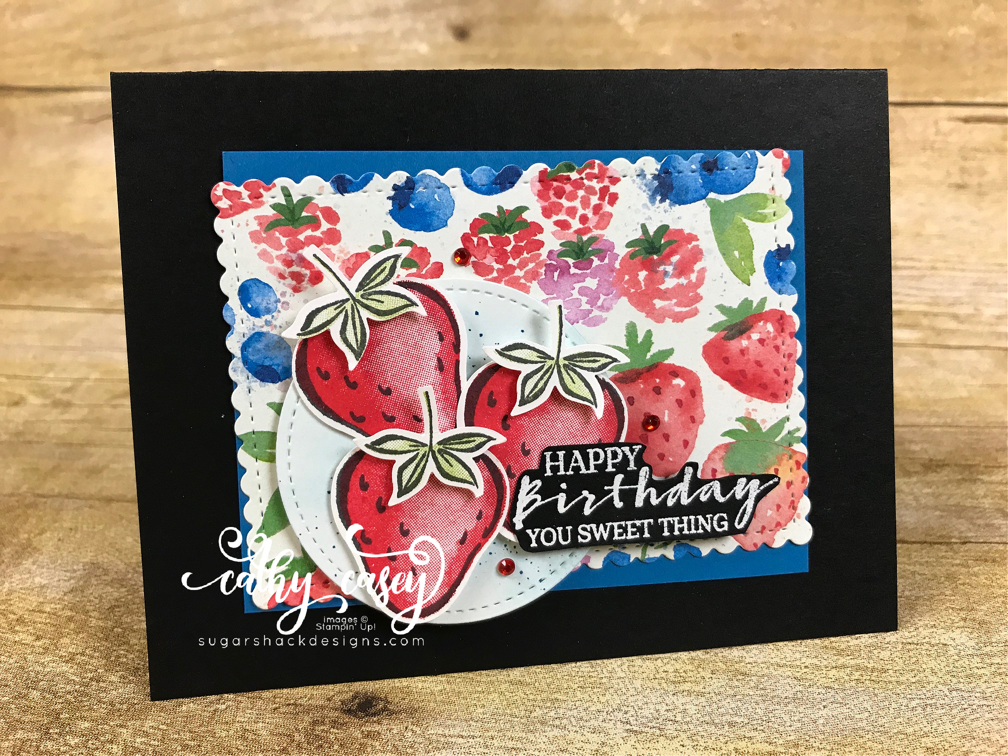 Today I’m sharing a sweet card featuring the Sweet Strawberry stamp set and coordinating punch. I absolutely love how the texture of the strawberry is built in to the stamp, it comes out beautifully! One of the best things about this set is that you can get the coordinating Designer Series Paper AND Berry Blossoms stamp set free with a $100 order starting January 5th! This paper is so lovely, the images are water colored and the colors are stunning. I just love it!