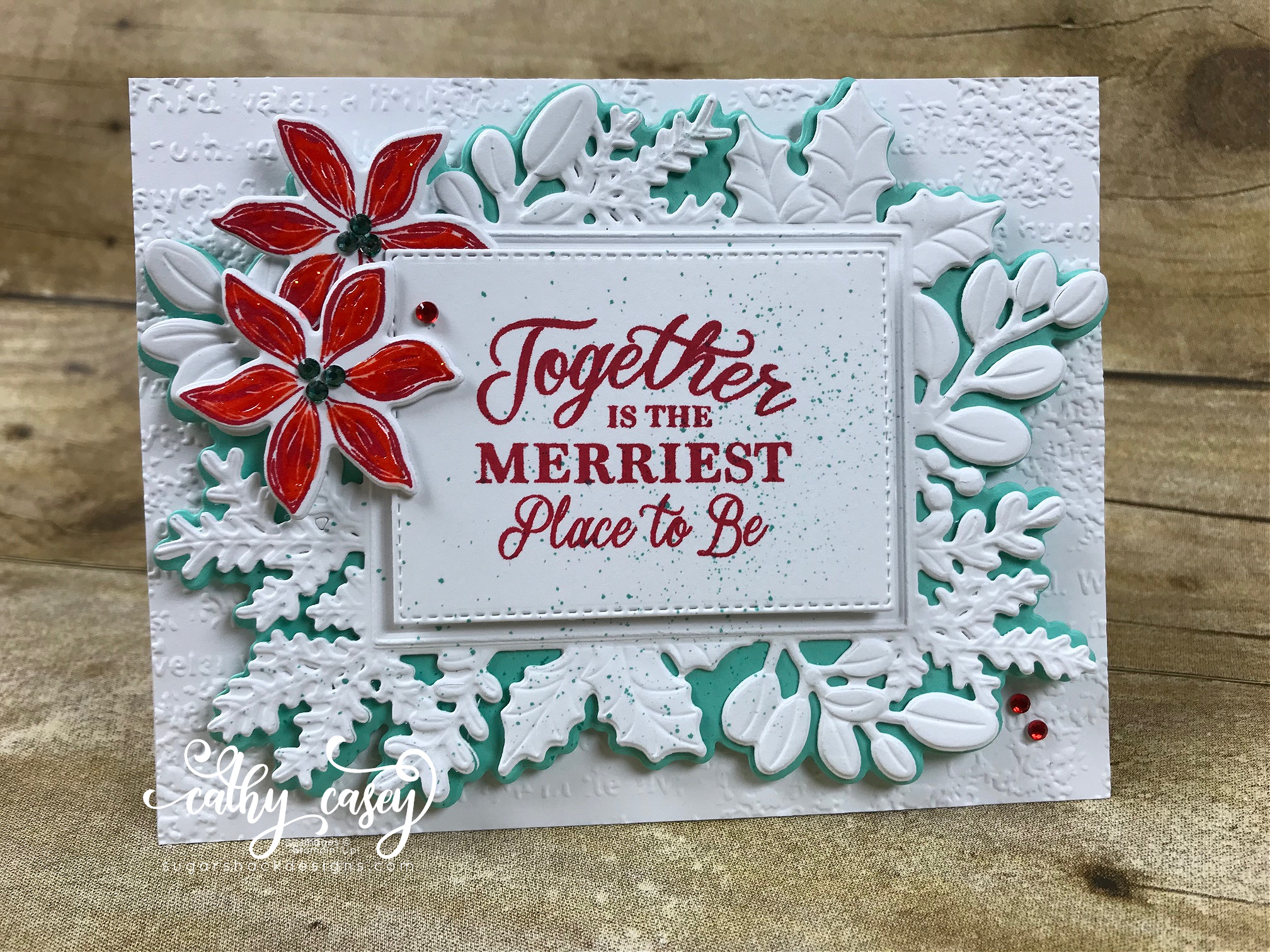 If you have’t checked out the Merriest Moments Bundle yet, you should! It includes a really cool “hybrid” embossing folder. You put the die inside the folder with your paper and put both through the die cutting machine together or you can use each separately. It is definitely the star of this card! I hope you enjoy!