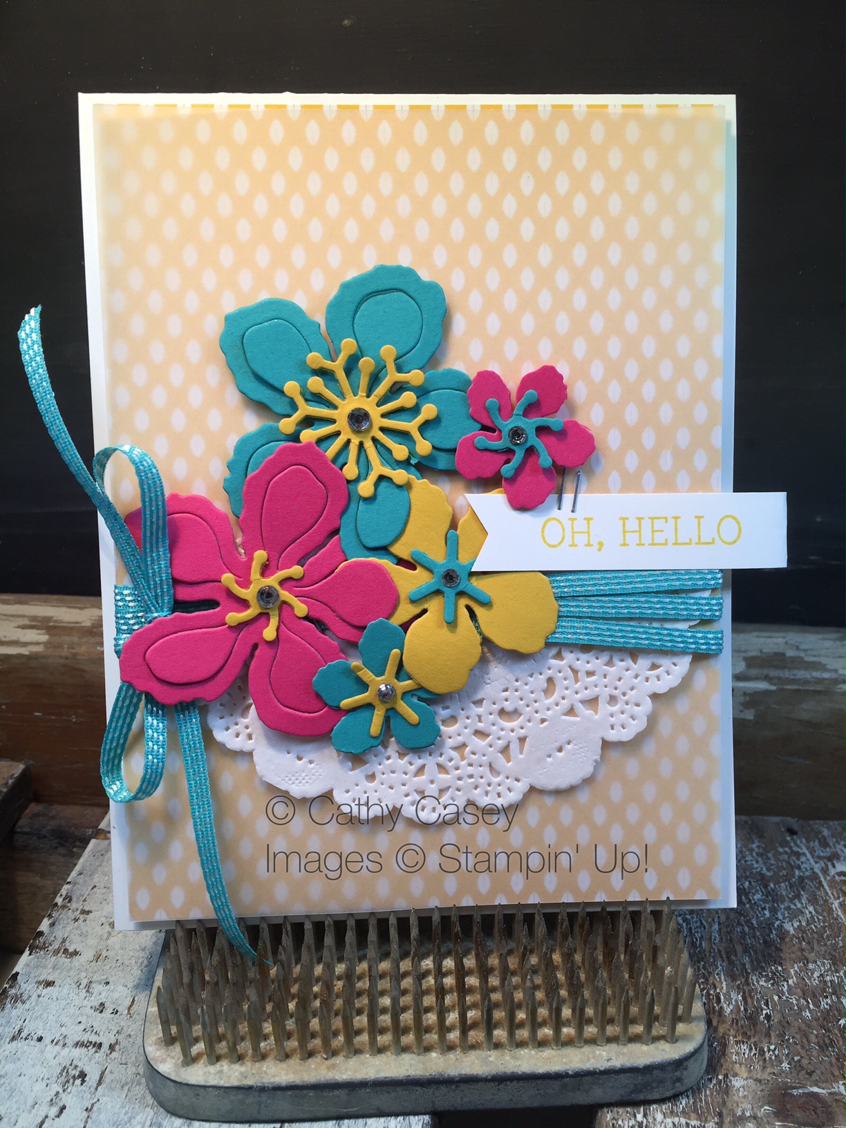 - The entire card front is offset on the front of the card and the flower die from the May Flowers Framelits picks up the Lemon Lime Twist in the stamping and the “YOU” die cut. The offset and the die cut add interest and make the whole card front pop.