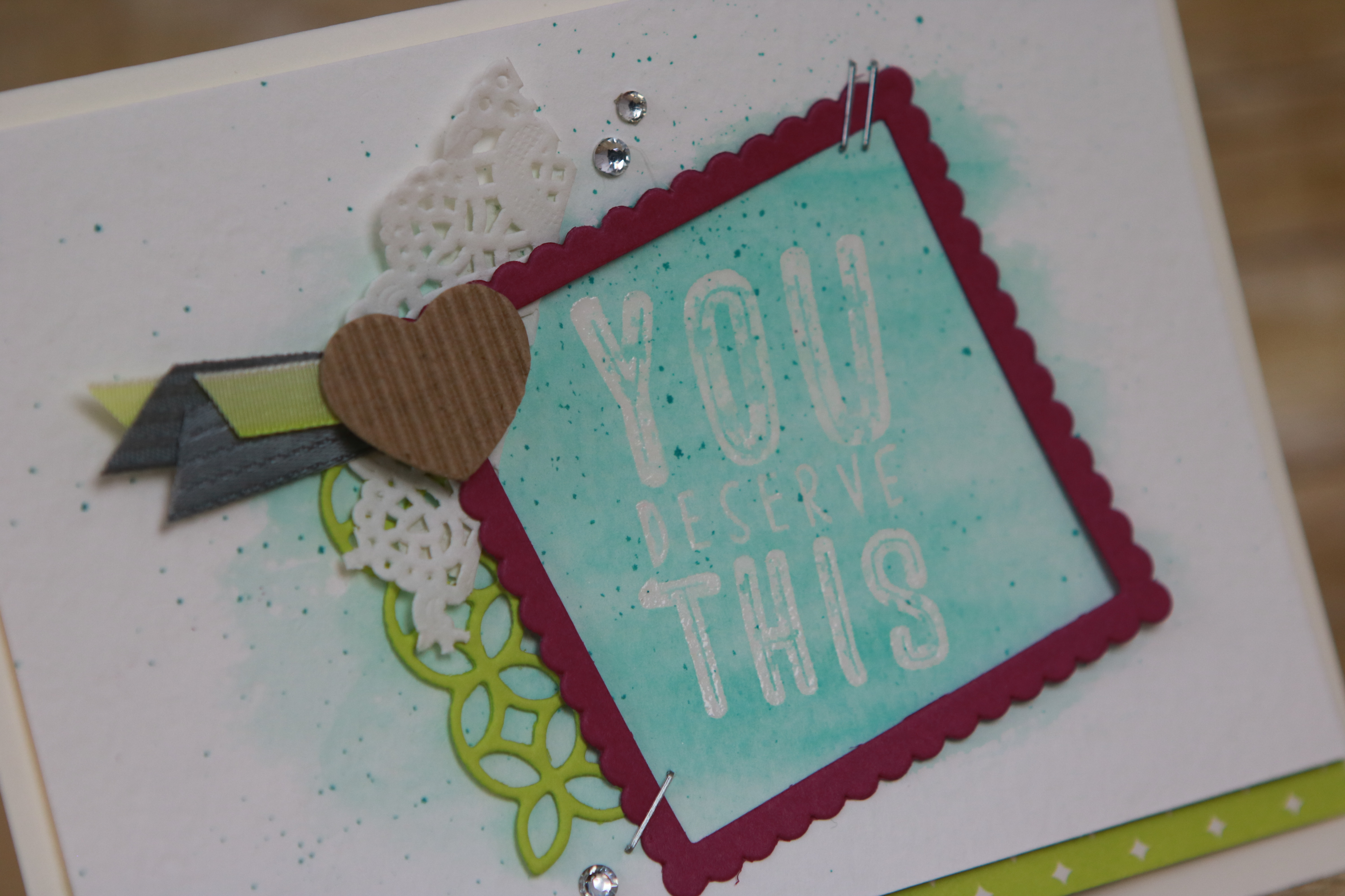 - The image I used from the stamp set is part of a huge background style stamp that I ultimately cut up into it’s individual parts. You can commit stamp abuse like I did or another option would be to mask off the parts of the stamp you didn’t want to get inky for your design. I heat embossed the “You Deserve This” portion of the stamp on Watercolor Paper with White Stampin’ Emboss Powder. After embossing, I added a watercolor wash of Bermuda Bay to make the image pop.