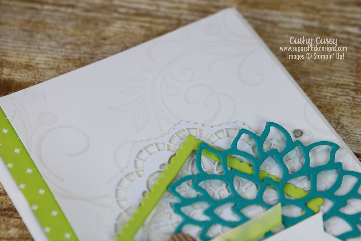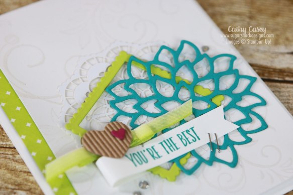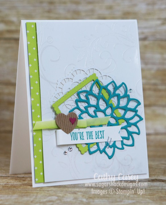 The Beautiful Day Stamp Set is perfect for this technique. We white embossed the big flower image on watercolor paper and then used Brusho to add the color. This flower features Prussian Blue and Brilliant Red, they create this luscious blueish purple color when they are allowed to activate together with water and not over worked. So pretty! After the flower dried, we fussy cut it out and popped it onto the card front. The rest of the card was fast and easy and showcased the beautifully colored flower 🙂