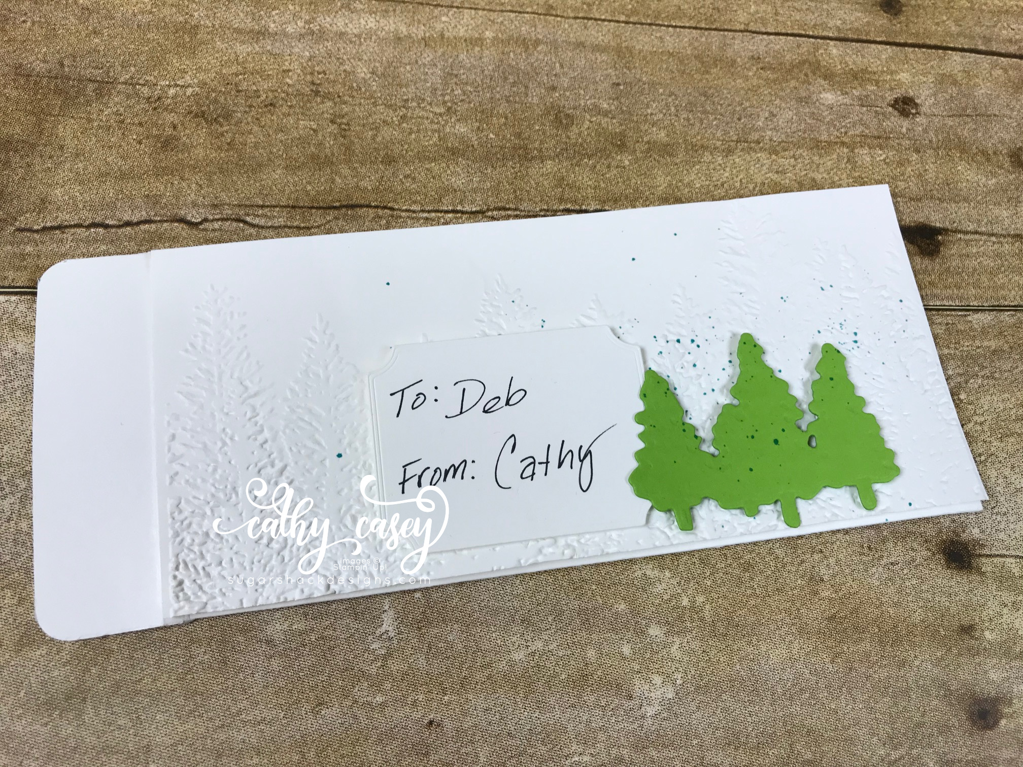 I really wanted a wide & narrow card to spread these images out in so I made up a card size to fit :). This card base is 6″ wide and 5″ tall, scored and folded at 2 1/2″. It made the perfect size to create my little landscape. Of course, I had to create a custom envelope to go with my cute card. This envelope wouldn’t mail well but it sure is cute with the extra decoration.