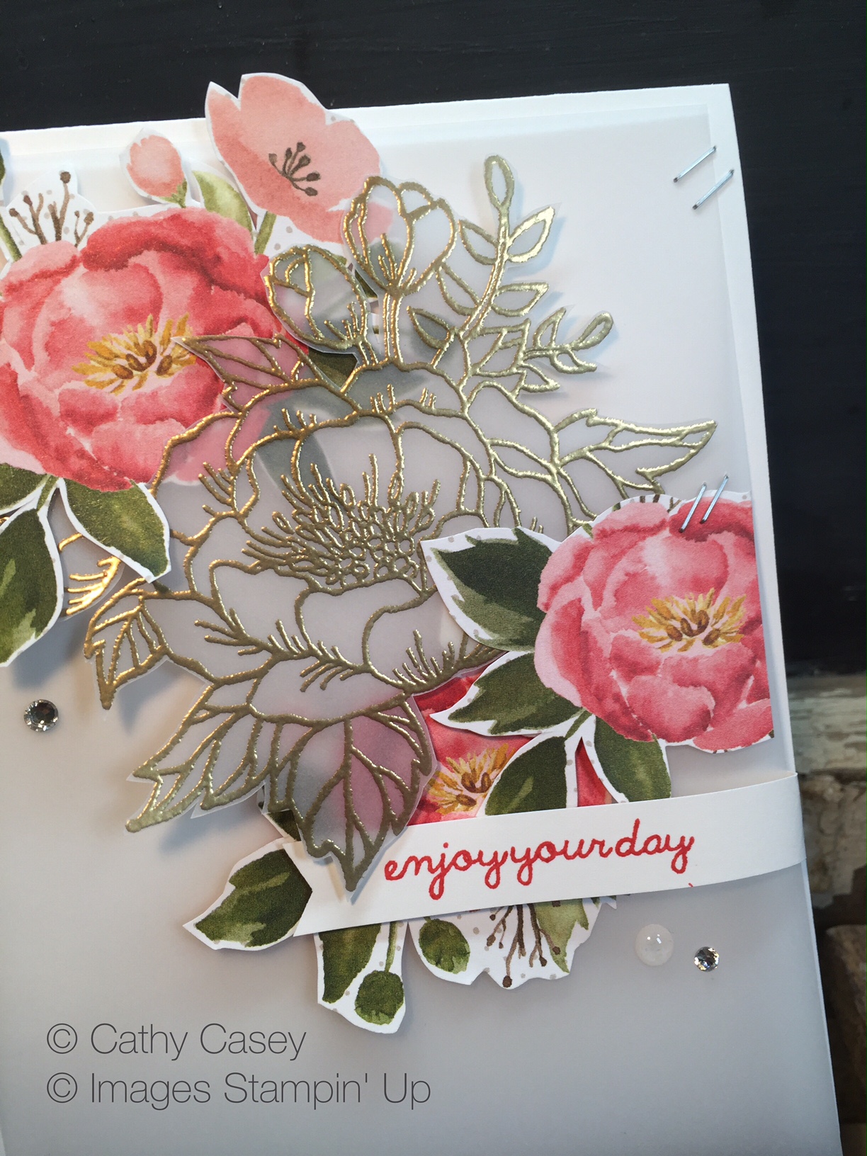 The cut flowers are layered with dimensionals to the card front with swirled Copper Metallic Thread underneath. The sentiment is attached to the card front with the paper clip. The finishing touch are sweet pearls added to the flowers and sentiment.